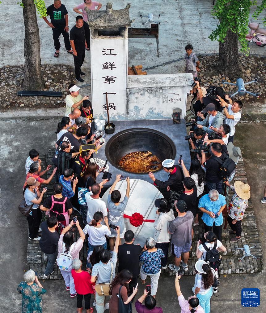 9月29日,富春江江鮮大會的主打項目"江鮮第一鍋"開鍋,吸引了眾多游客前來品嘗(無人機照片)。"江鮮第一鍋"是在直徑1.5米的大鐵鍋中燉煮上百斤的江鮮鰱魚,香氣四溢。