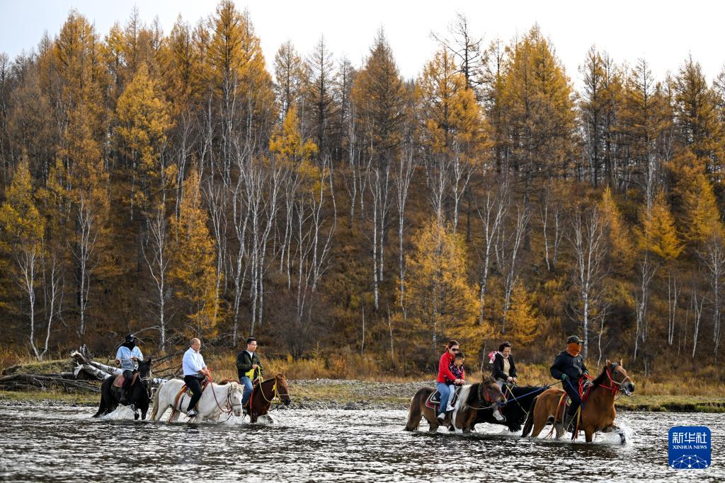 9月29日,游客在內(nèi)蒙古阿爾山國家森林公園不凍河上騎馬。