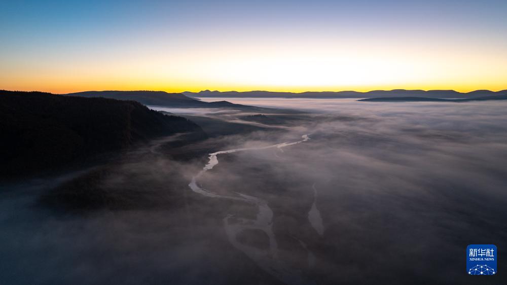 9月29日拍攝的日出前的內(nèi)蒙古阿爾山國家森林公園景色(無人機照片)。
