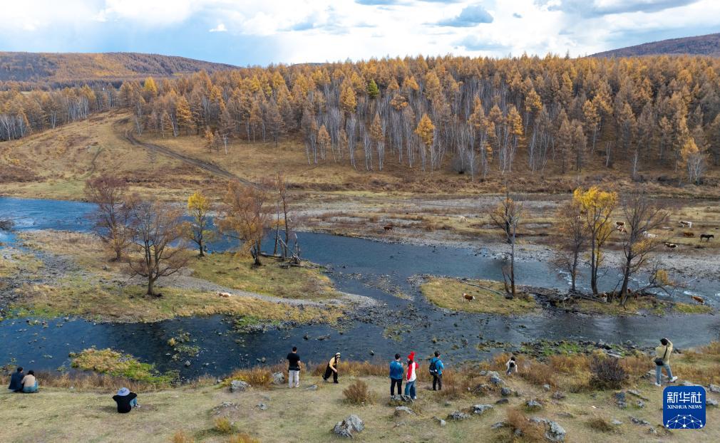 9月29日,游客在內(nèi)蒙古阿爾山國家森林公園不凍河旁游玩(無人機照片)。