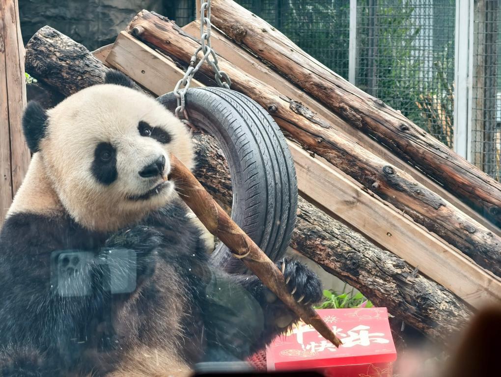 當天恰逢中秋佳節,北京動物園也為動物們送上了特色月餅。工作人員為大熊貓制作了“窩頭月餅”,為貘、羊駝送上了“苜蓿月餅”,為犀牛、河馬制作了“輪胎月餅”,為熊山的動物們制作了“雜食月餅”,一系列特色美食讓動物們也一起歡度佳節。