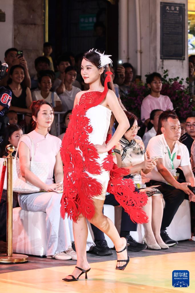 10月7日晚,作為2025海口藝術周系列活動之一,錦色·2025非遺潮秀在??隍T樓老街啟幕。活動以"非遺再創"為核心,將剪紙藝術元素融入時裝走秀。