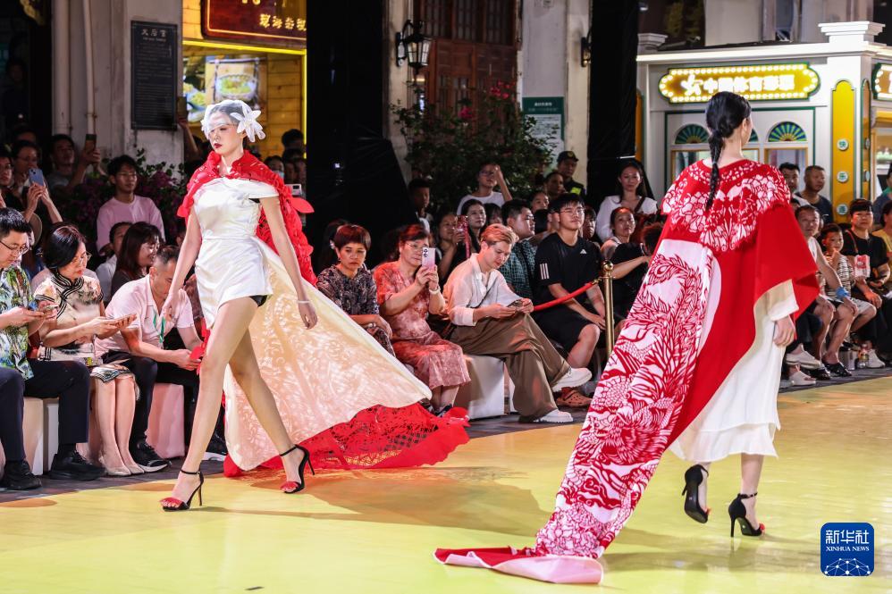 10月7日晚,作為2025海口藝術周系列活動之一,錦色·2025非遺潮秀在海口騎樓老街啟幕。活動以"非遺再創"為核心,將剪紙藝術元素融入時裝走秀。