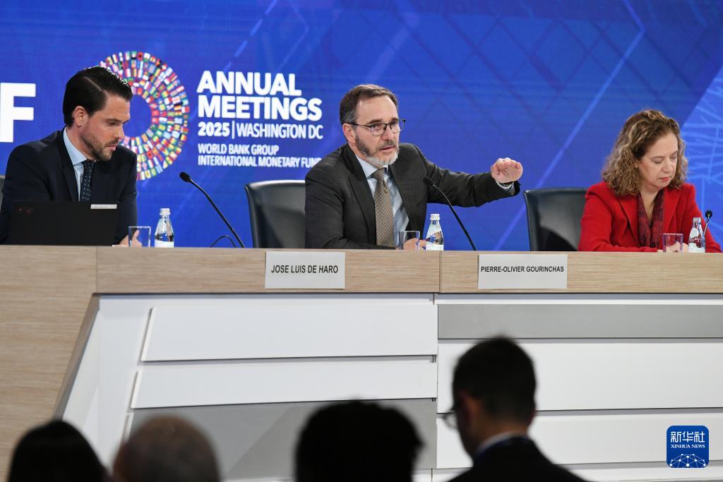 10月14日,在美國(guó)華盛頓,國(guó)際貨幣基金組織首席經(jīng)濟(jì)學(xué)家皮埃爾-奧利維耶·古蘭沙(中)在《世界經(jīng)濟(jì)展望報(bào)告》新聞發(fā)布會(huì)上講話。