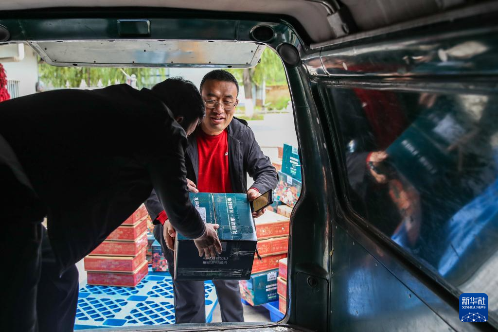 10月14日,在甘肅省隴南市禮縣永興鎮一家電子商務有限公司,郵政工作人員將包裝好的禮縣蘋果裝車。
