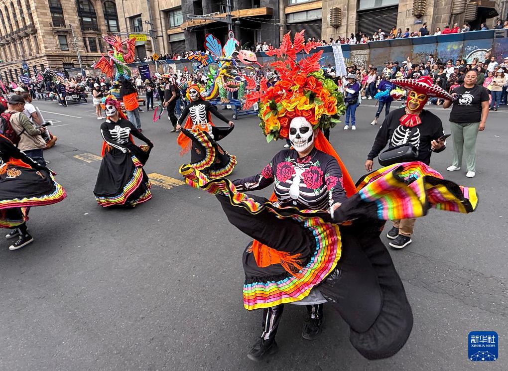 10月18日,在墨西哥首都墨西哥城,身著亡靈節服飾的舞者參加魔幻動物大游行(手機照片)。