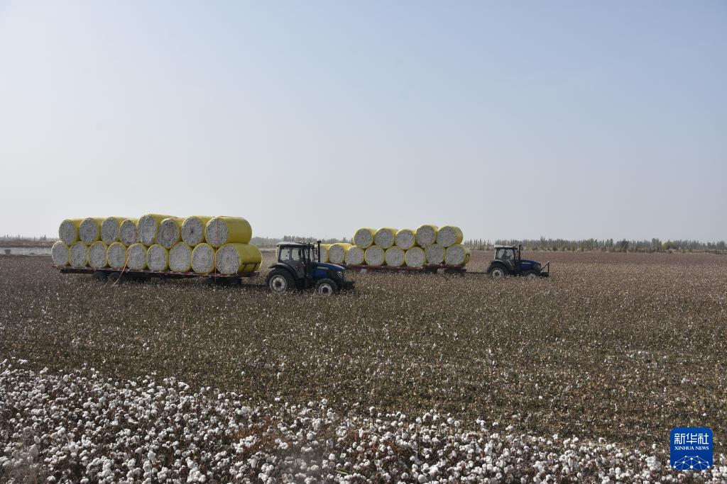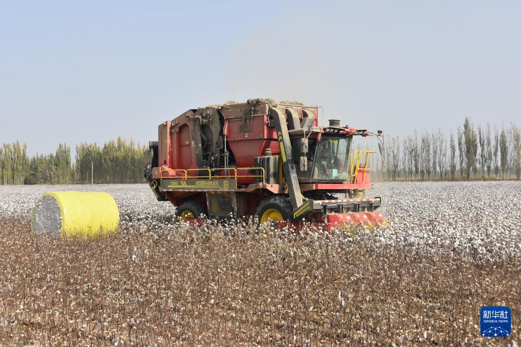 10月21日,采棉機在新疆阿克蘇地區沙雅縣的棉田中工作,旁邊是剛采收打包好的棉花。