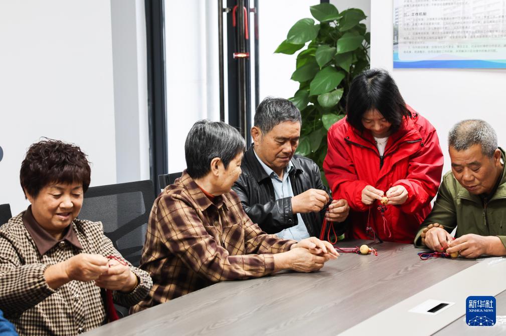 10月21日,志愿者教老人制作小葫蘆掛件。