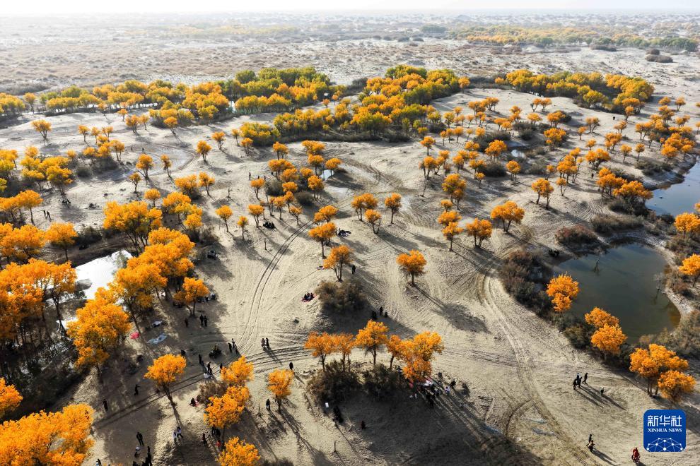 游客在新疆和田地區洛浦縣洛濱胡楊林景區游覽(無人機照片,10月19日攝)。