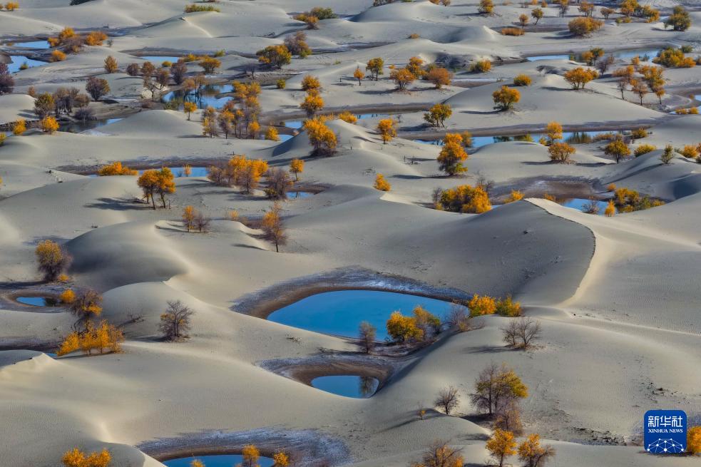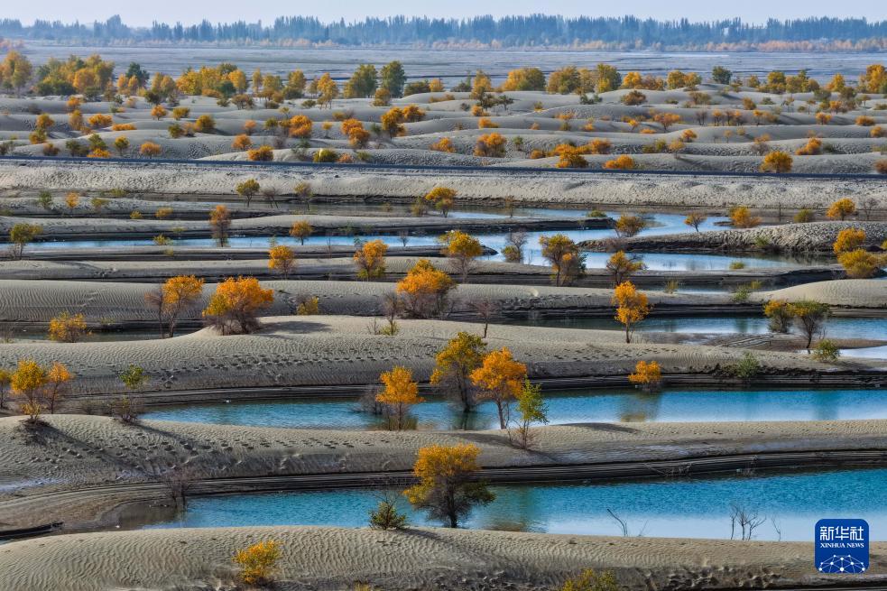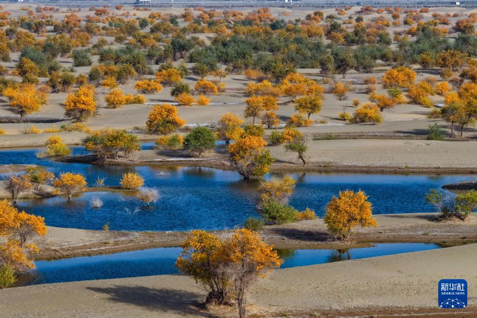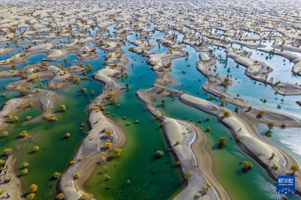 在新疆和田地區和田縣翡翠湖,成片胡楊林坐落其中(無人機照片,10月20日攝)。