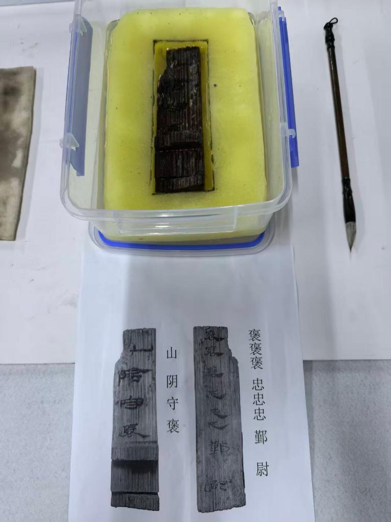 記者看到,有一件文書(shū)檢已經(jīng)識(shí)讀出來(lái),兩面均是清晰的漢隸字體,正面墨書(shū)"山陰守褒",反面墨書(shū)"褒褒褒 忠忠忠 鄞尉"。李龍彬告訴記者,這應(yīng)是當(dāng)時(shí)官員練習(xí)書(shū)寫(xiě)的文書(shū)檢。習(xí)字內(nèi)容可能與會(huì)稽太守對(duì)鄞縣縣尉的嘉獎(jiǎng)有關(guān)。(記者馮源)