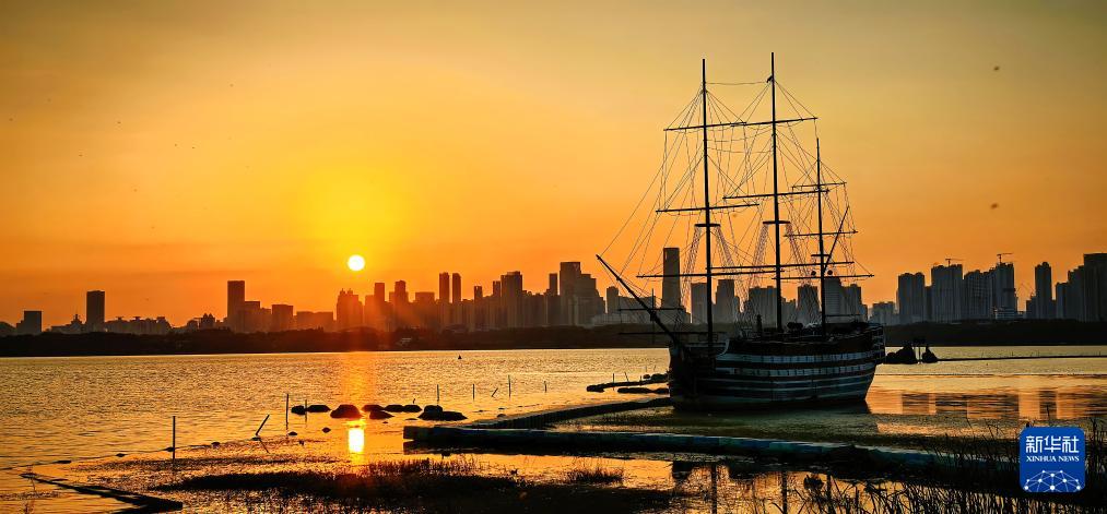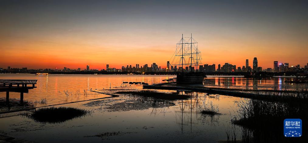 10月22日,湖北省武漢市的東湖風景區在夕陽和晚霞的映襯下,壯美如畫。新華社記者 沈虹冰 攝