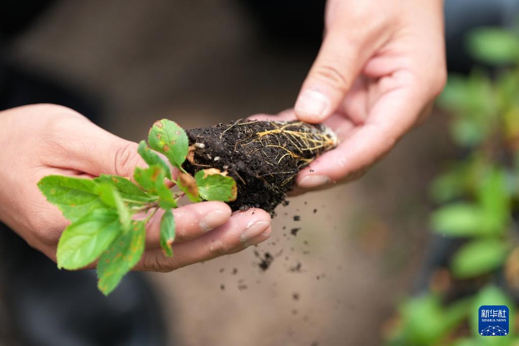 6月10日,在白水縣興華果蔬有限責任公司,技術人員查看組培脫毒蘋果砧木苗的生長情況。