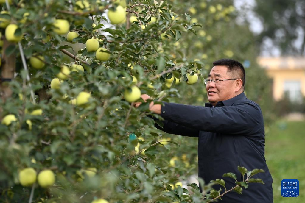 10月21日,西北農林科技大學白水蘋果試驗站首席專家趙政陽教授查看試驗站內"瑞雪"蘋果的生長情況。