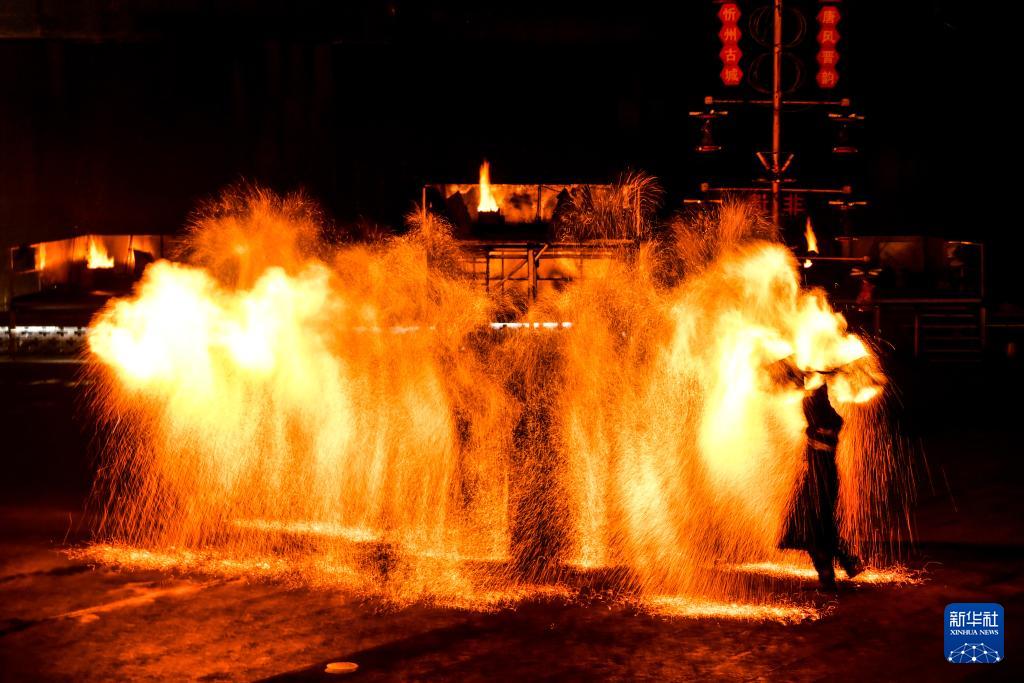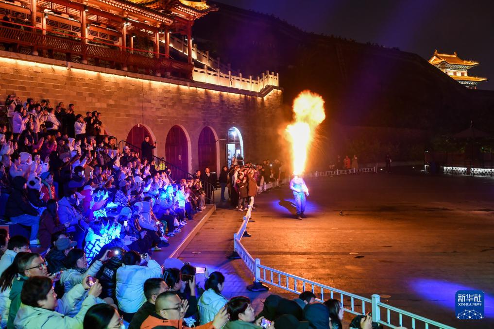 這是10月23日拍攝的忻州古城內的“火壺”表演。