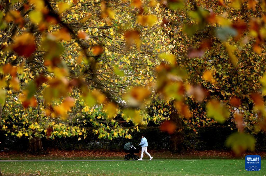 10月27日,一名女子手推嬰兒車走在英國倫敦攝政公園。