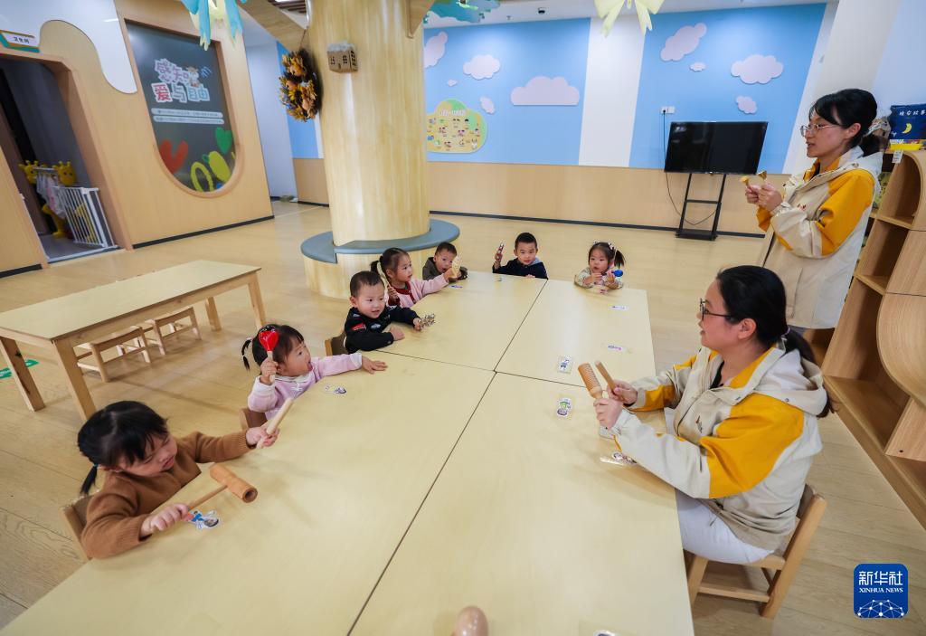 10月28日,在嘉興市南湖區(qū)七星街道湘城社區(qū)鄰里中心的普惠托育園,保育老師帶領(lǐng)幼兒上音樂律動(dòng)課。