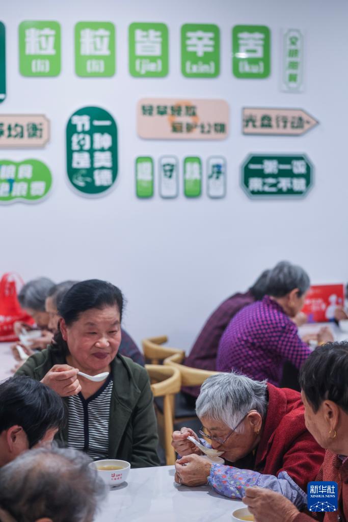 10月28日,老人們?cè)诩闻d市南湖區(qū)七星街道湘城社區(qū)鄰里中心幸福食堂用餐。