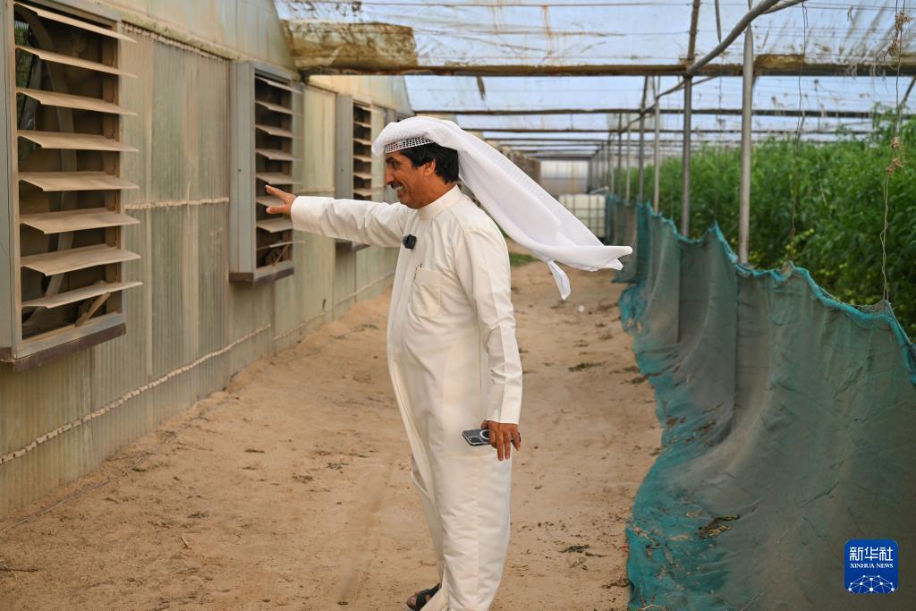 10月31日,在科威特艾哈邁迪省沃夫拉地區,農場主薩里·阿茲米介紹大棚中的風冷設備。
