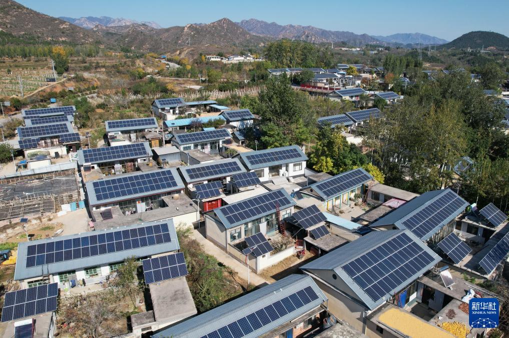11月2日拍攝的河北省平山縣西柏坡鎮(zhèn)北莊村兆瓦級(jí)“光儲(chǔ)”智能微電網(wǎng)示范工程項(xiàng)目中的屋頂光伏發(fā)電板(無人機(jī)照片)。