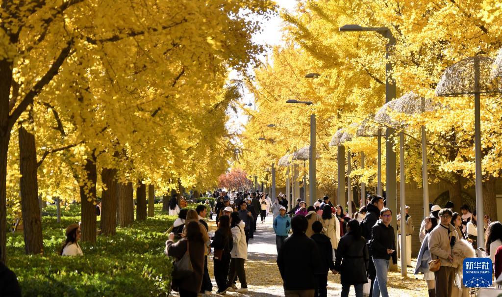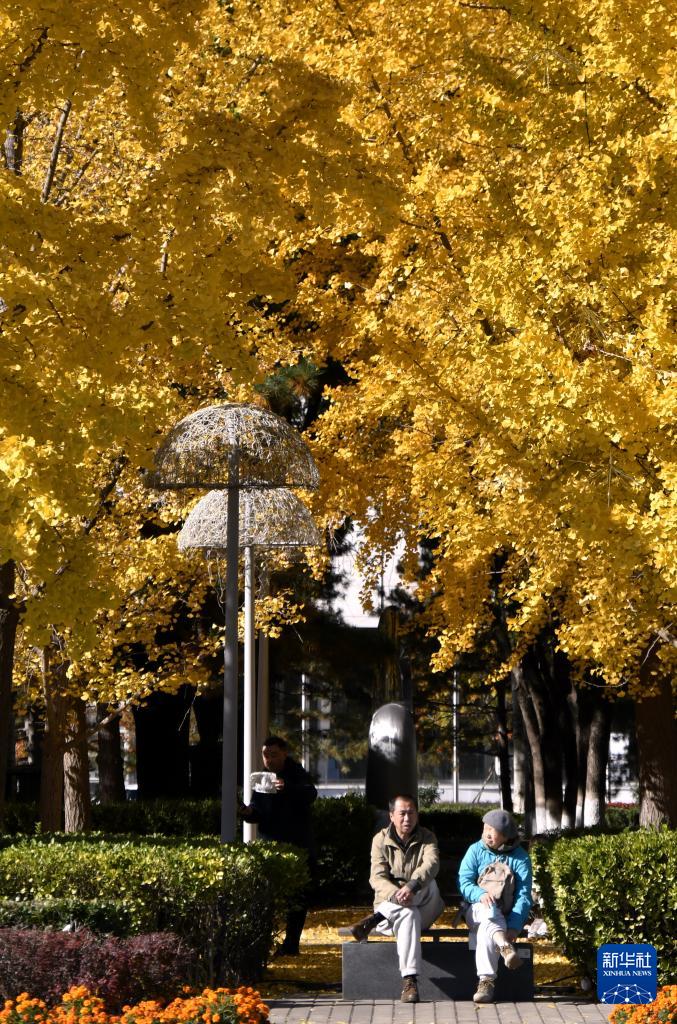 深秋時節,北京市街頭和公園內的銀杏等樹木掛滿黃葉,濃濃的秋色吸引大批市民踏秋賞景。