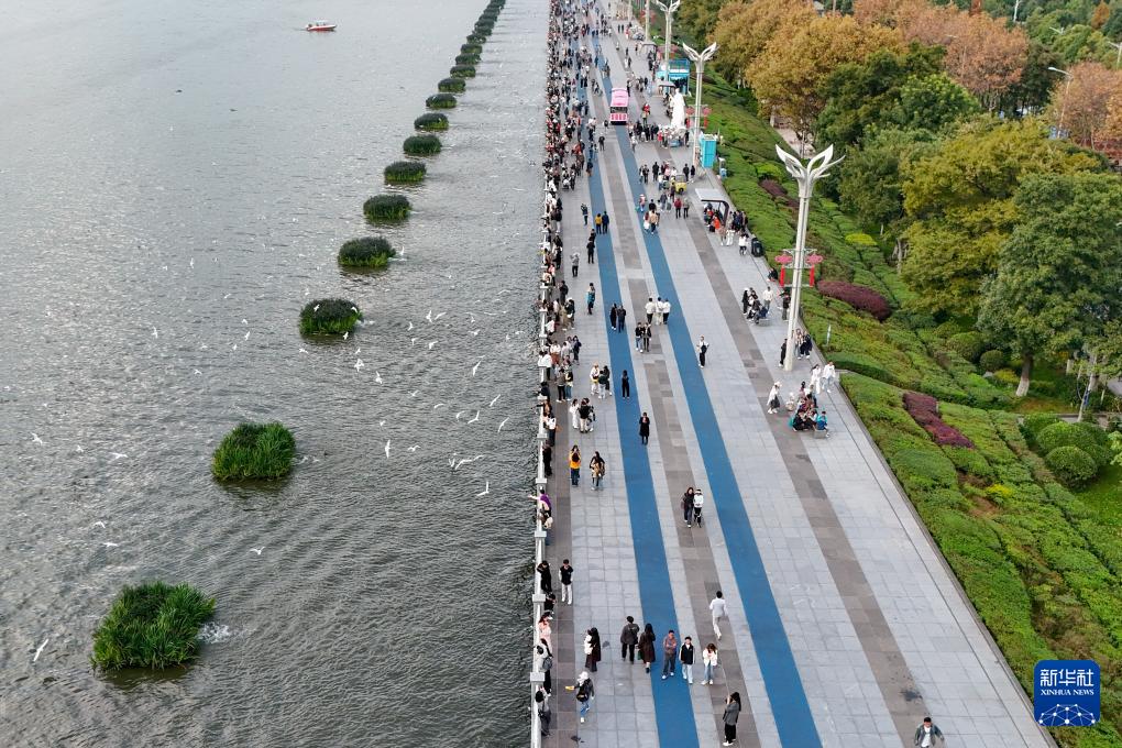 11月1日,游客在滇池畔的海埂大壩游玩、喂鷗(無人機(jī)照片)。