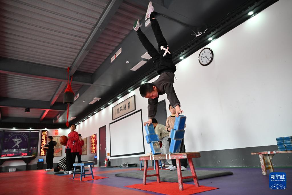 10月28日,河北省滄州市吳橋縣大運河堤頂路沿線張碩雜技小院的學員練習雜技。