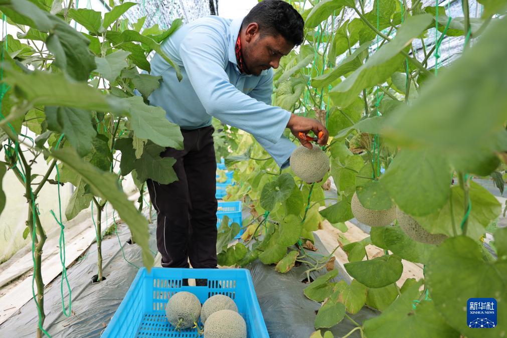 11月3日,在文萊斯里巴加灣市郊一處農(nóng)業(yè)科技產(chǎn)業(yè)園,來自中國寧夏回族自治區(qū)固原市的農(nóng)業(yè)技術(shù)專家李繼華檢查剛采摘下來的網(wǎng)紋蜜瓜。