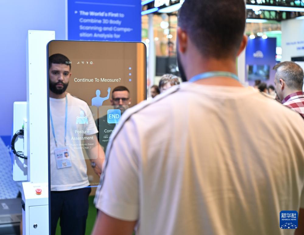 11月3日,客商在廣交會展館體驗一款智能身體測量產品。