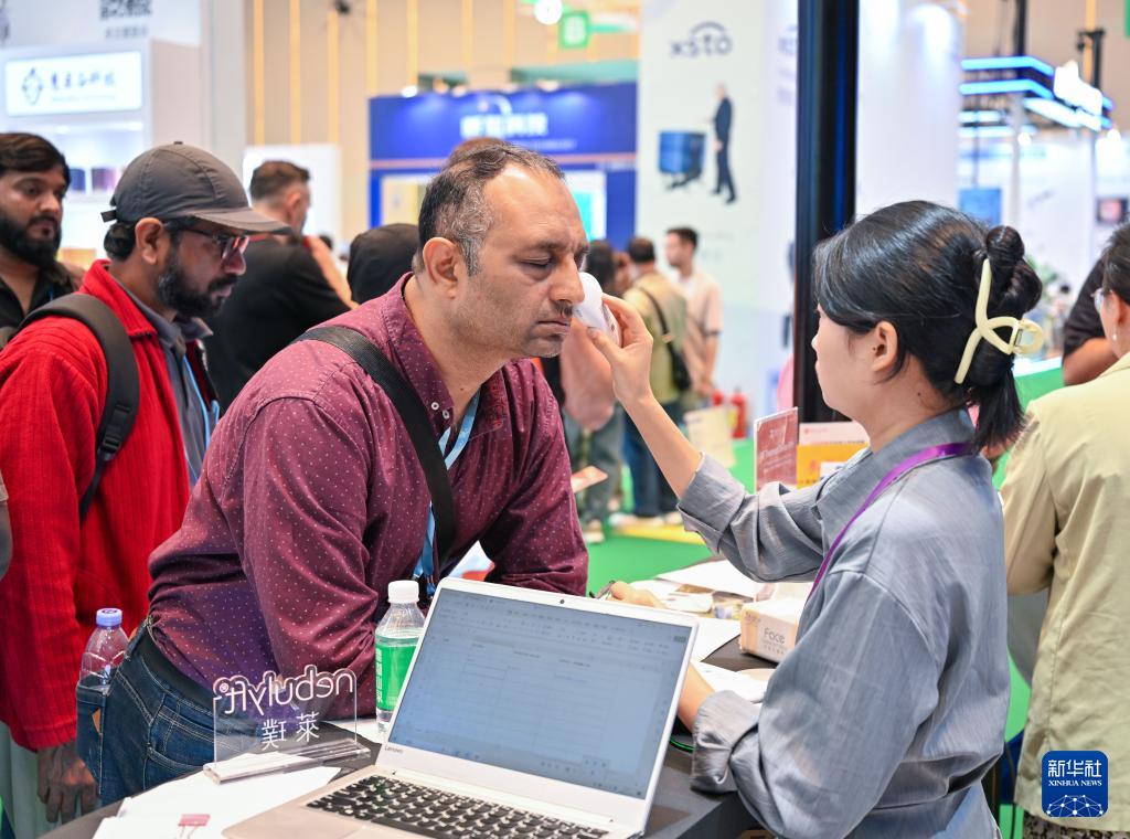 11月3日,客商在廣交會展館體驗一款美容產品。
