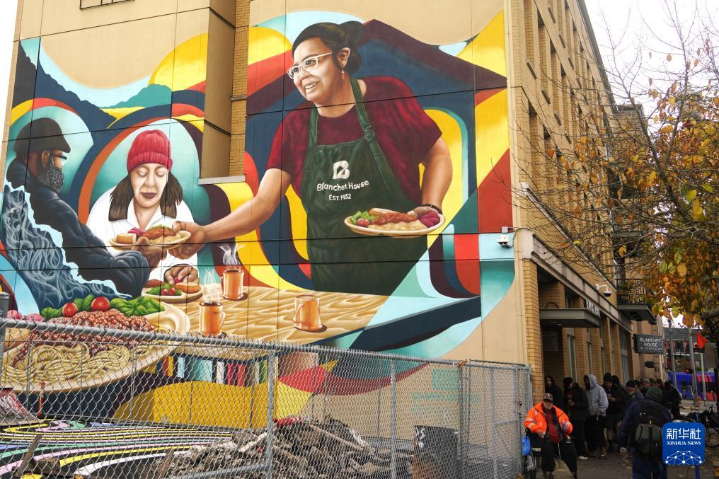 11月4日,在美國俄勒岡州波特蘭,等待領(lǐng)取免費(fèi)食物的人們在街頭排起長隊。