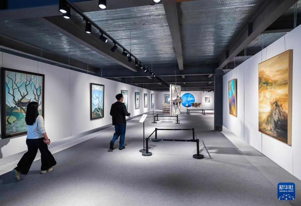 11月5日,游客在濮院時尚古鎮的互聯網生活嘉年華觀看藝術展。