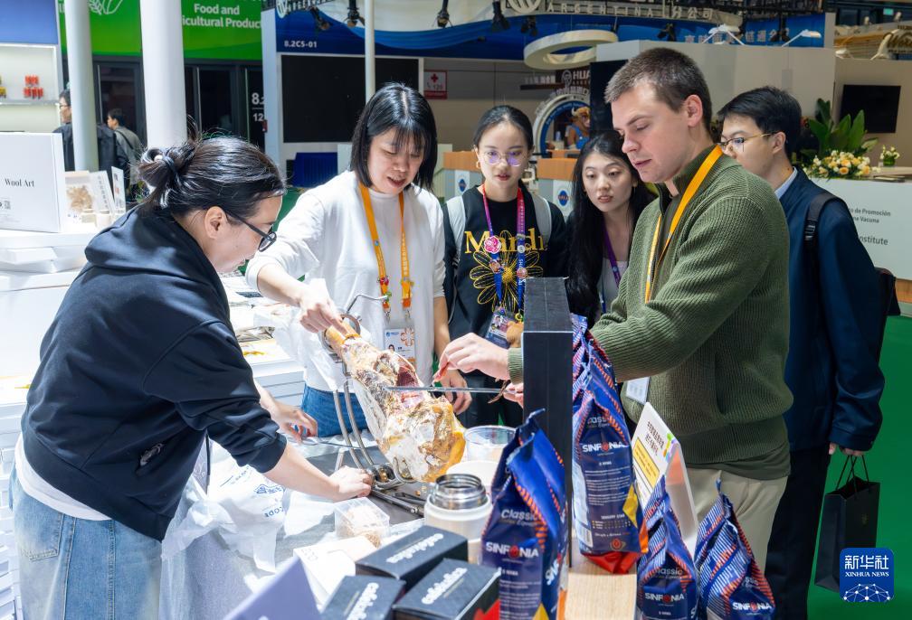 11月5日,觀眾在第八屆進博會農食產品展區大商集團展臺品嘗進口火腿。