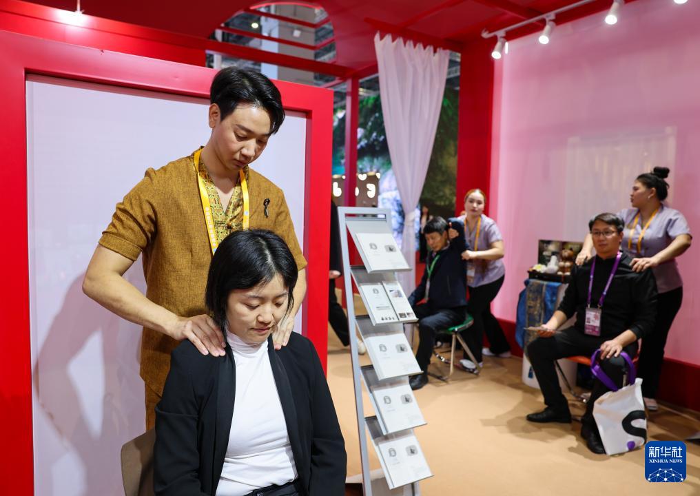 11月5日,人們在第八屆進博會國家展泰國館體驗泰式按摩。