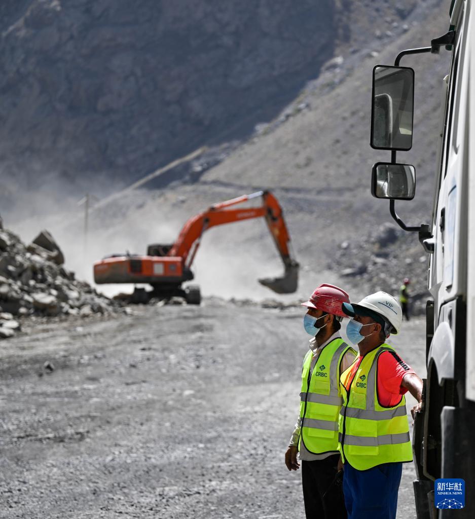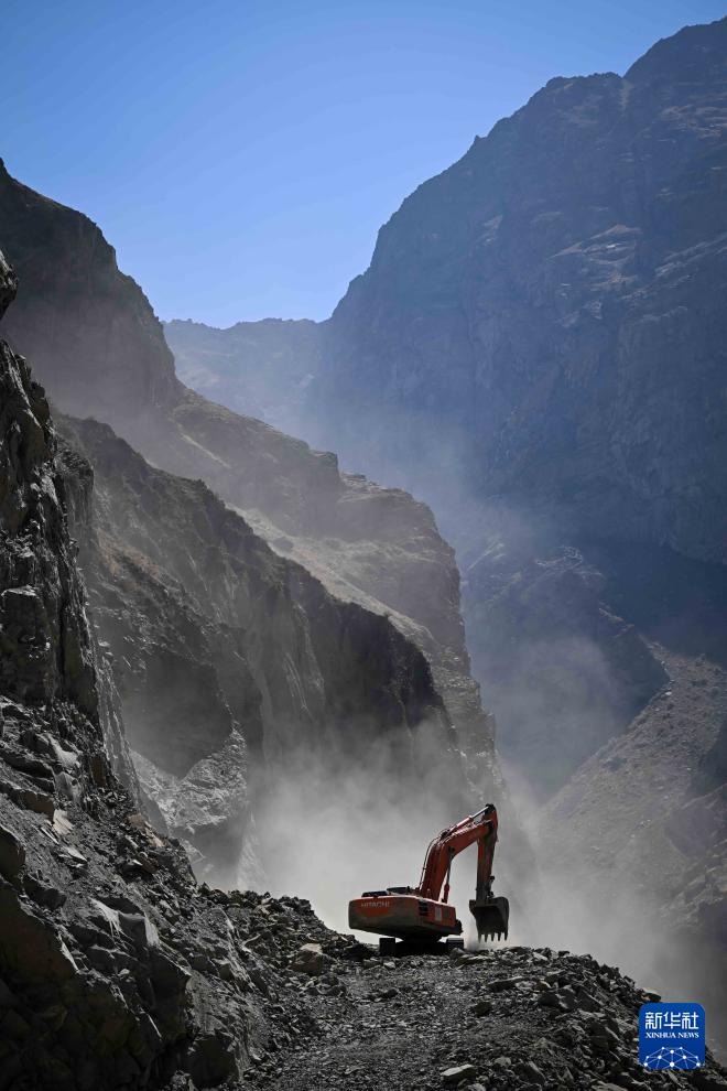 這是9月11日在塔吉克斯坦卡拉依洪姆村附近拍攝的中塔公路二期工程施工現場。