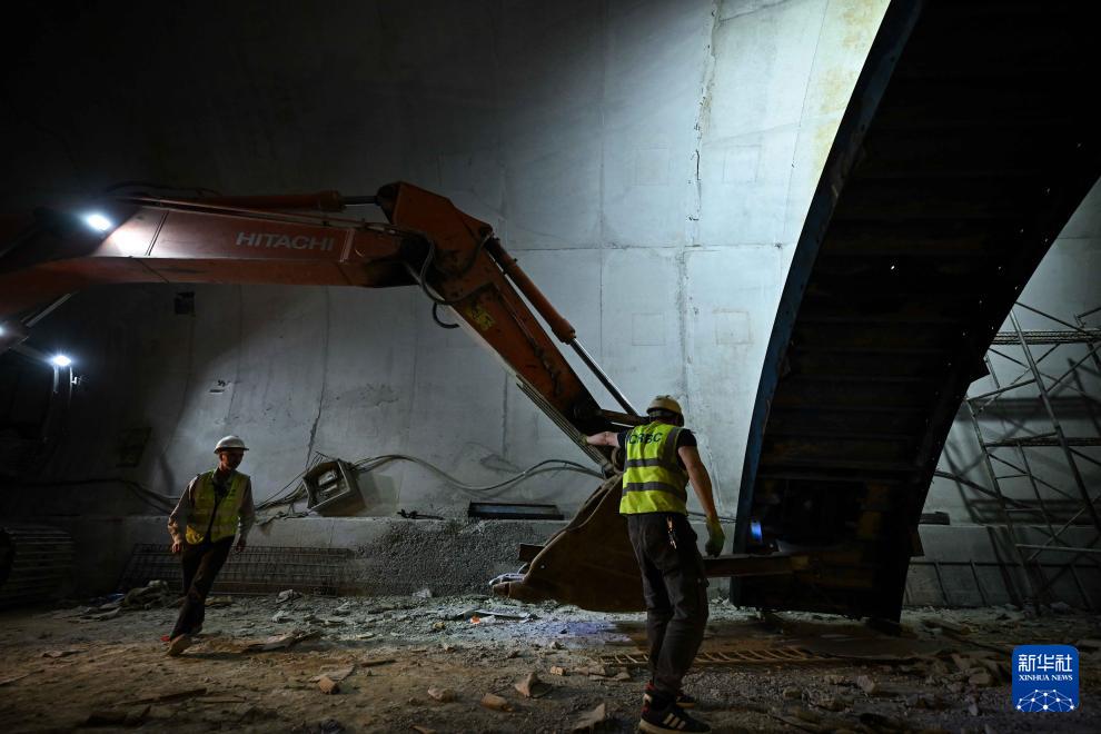 9月11日,工人在塔吉克斯坦卡拉依洪姆村附近的中塔公路二期工程1號隧道施工現場工作。