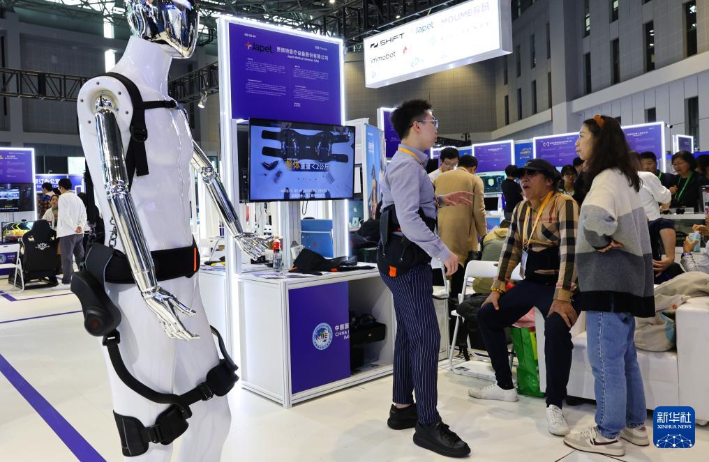 11月9日,工作人員(左)在向參觀者介紹一款外骨骼產品。