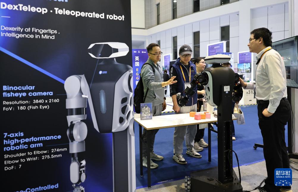 11月9日,參觀者(左)在一個配備雙目魚眼鏡頭視覺組件的遙操作機器人展品前與工作人員交流。
