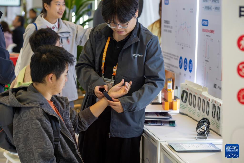 11月9日,在創新孵化專區,參觀者(左)體驗防暈車手環。