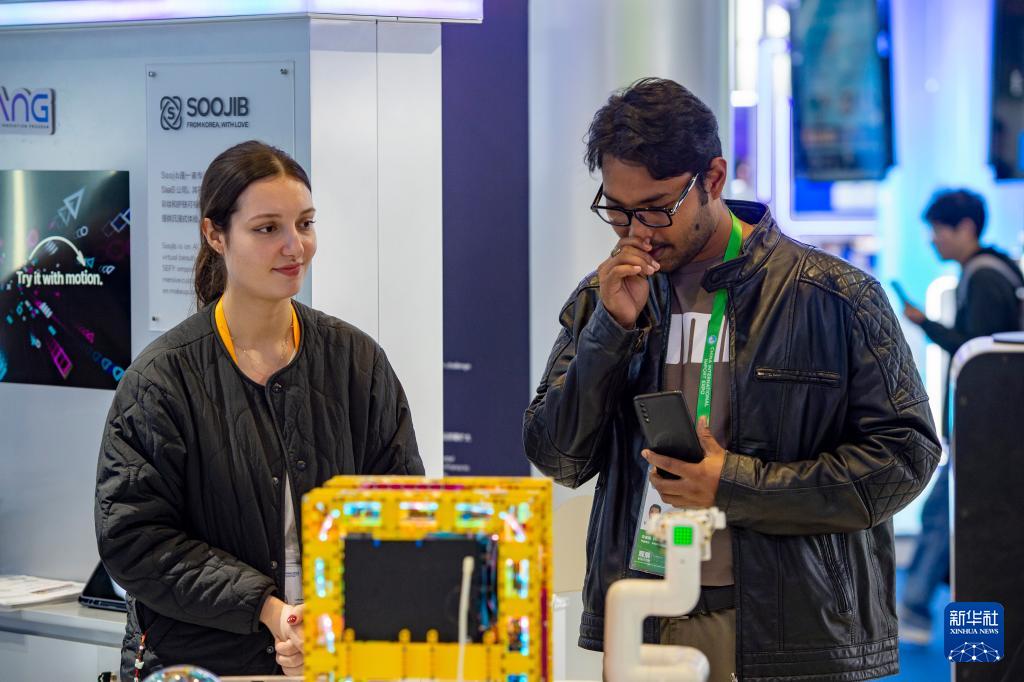 11月9日,在創新孵化專區,參觀者(左)體驗可穿戴設備。