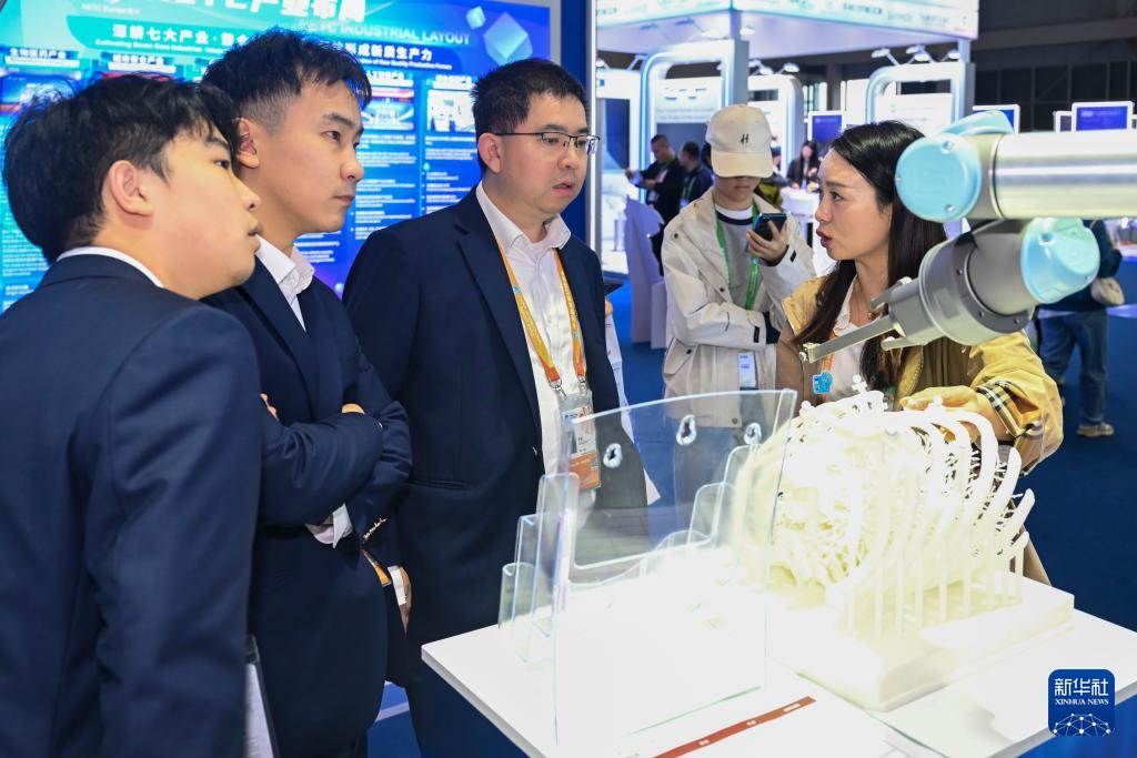 11月9日,在創新孵化專區,展商(右一)向參觀者介紹經皮介入智能手術機器人。