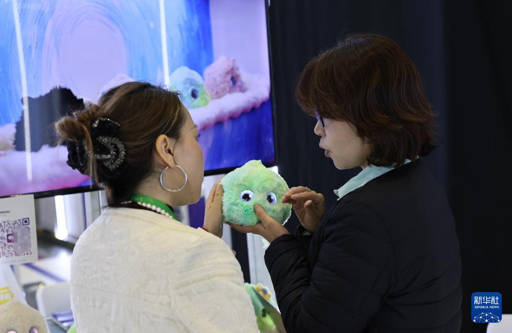 11月9日,工作人員(右)為參觀者介紹一款情緒療愈AI機器人。