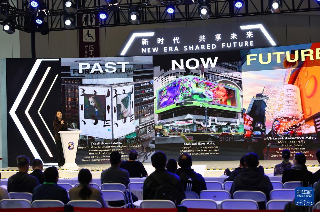 這是設在創新孵化專區內的產品發布宣介區,一位參展商正在介紹基于AI技術的虛擬廣告產品(11月9日攝)。