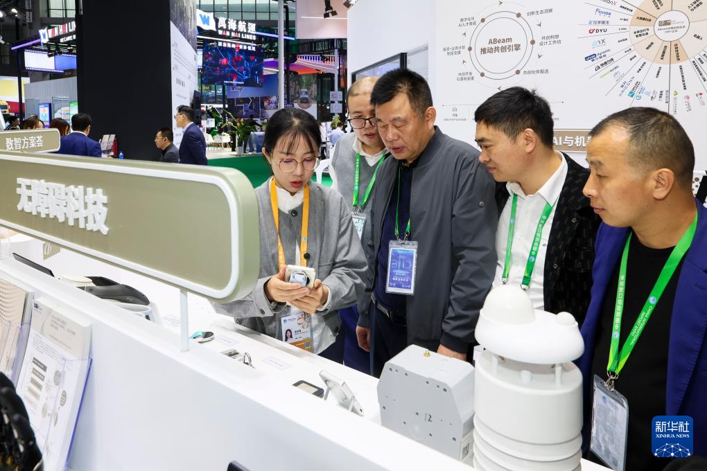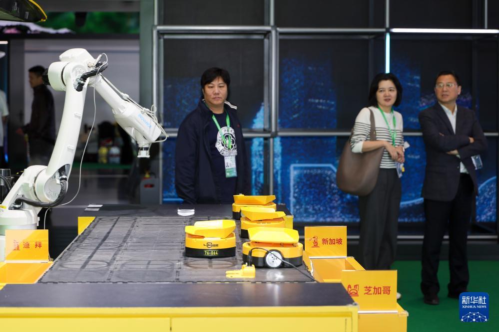 11月9日,參展人員在第八屆進博會服務貿易展區DHL(敦豪)展臺查看智能物流系統。