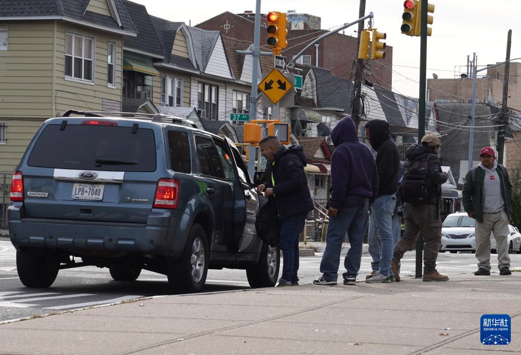 11月7日,在美國紐約一處街頭零工市場,一名勞工被雇主雇用。