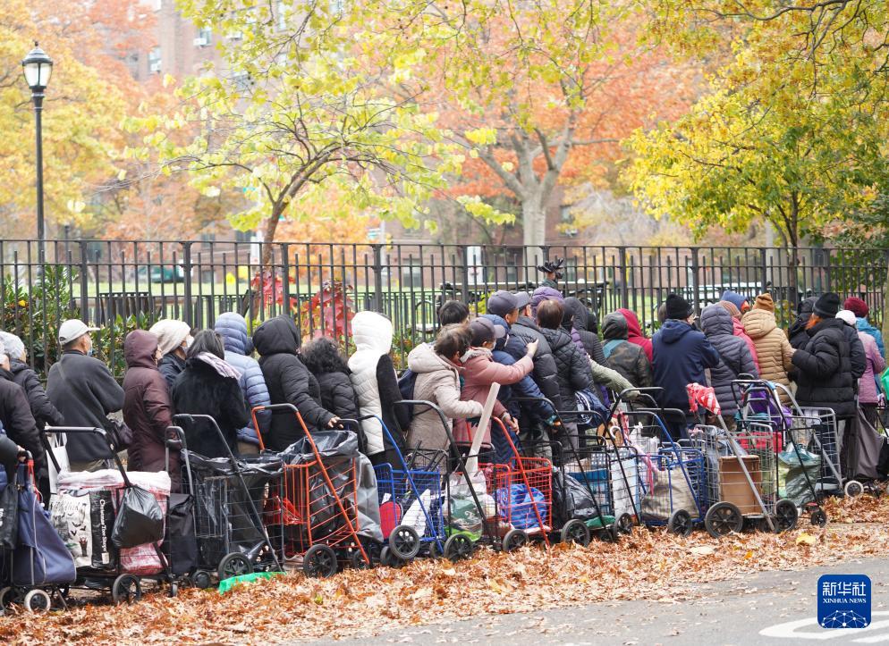 11月12日,人們在美國紐約一處食物發放點領取食物。