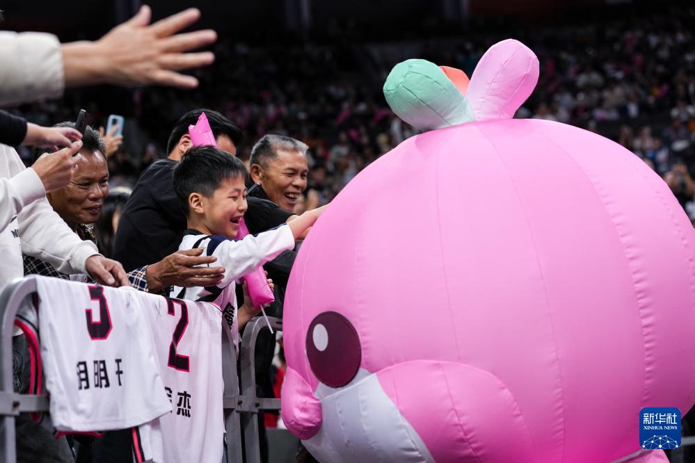 11月12日,四川隊球員周琦(右)的孩子和廣東隊球員沈梓捷(左)在頒獎儀式上。