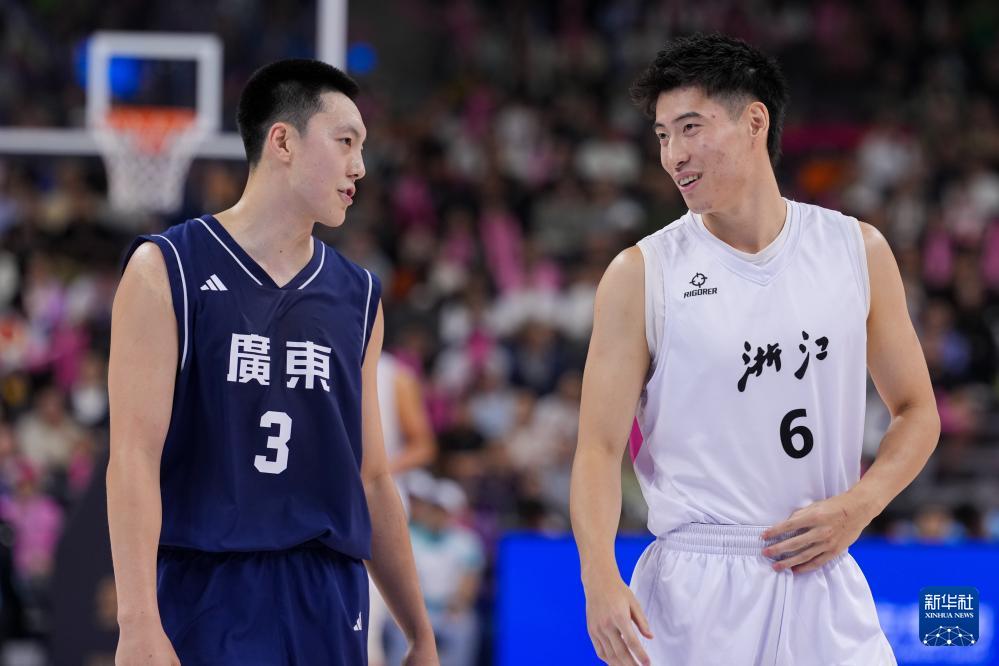 11月12日,廣東隊球員胡明軒(左)和浙江隊球員程帥澎在比賽中交流。