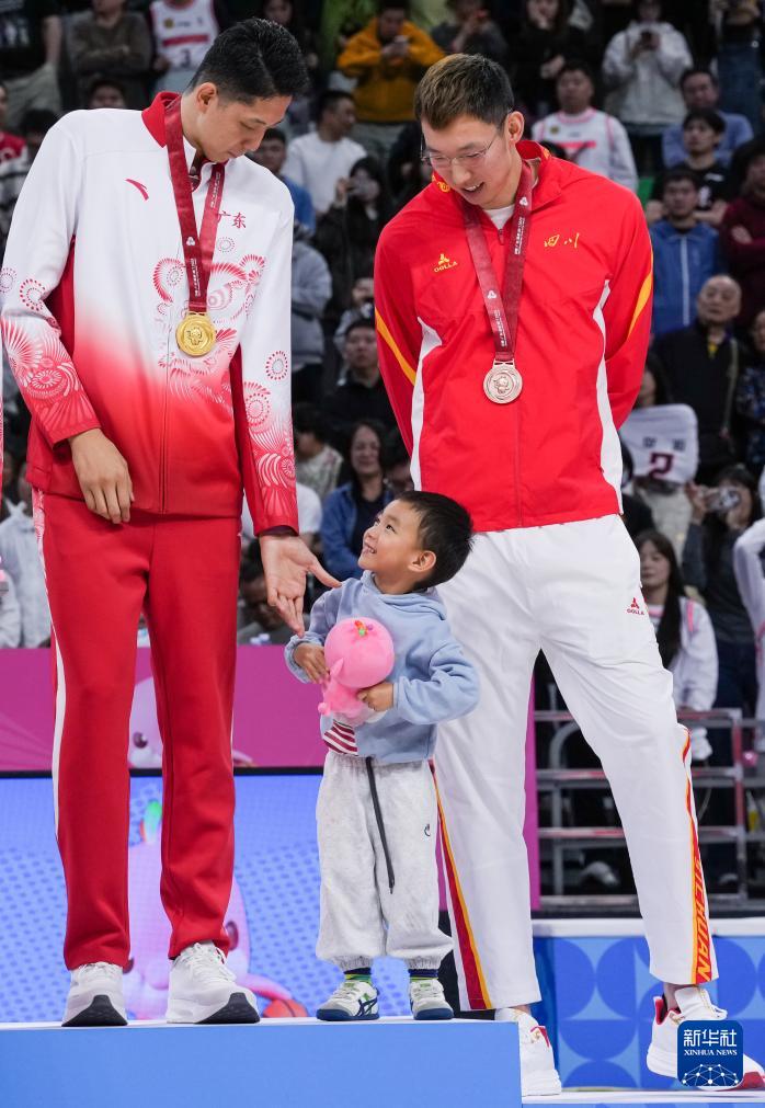 11月12日,四川隊球員周琦把銅牌拿給自己的孩子看。