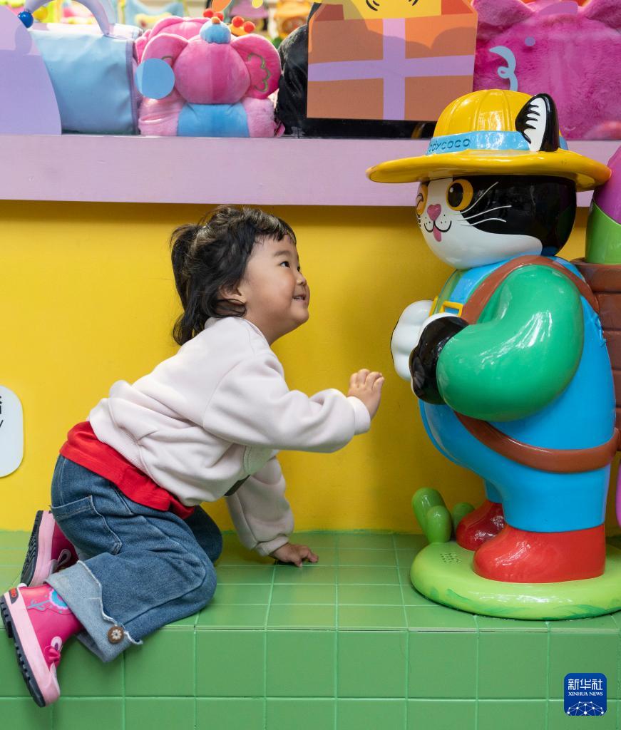 11月12日,在上海市長寧區愚園路的有蒂棵棵網紅小店,小朋友與門口的小貓玩偶互動。